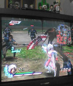 見辛くて申し訳ありません。カラーチェンジで 白ピンクに染め上げた殿ですV かあーーーわーーーーーーいいーーーー!!!! っつか 戦場で浮き過ぎ(爆) いっそのこと白無垢でさこぬの胸に飛び込もうかと。 ちなみに、ゲームを起動してほっとくと 流れるデモ画面、 カラーチェンジしたキャラはその色で登場します(笑) びっくりしたよ、自分で変えといて(爆) |