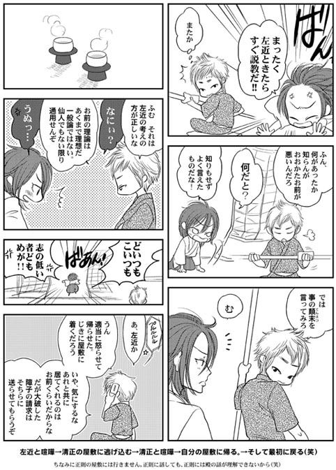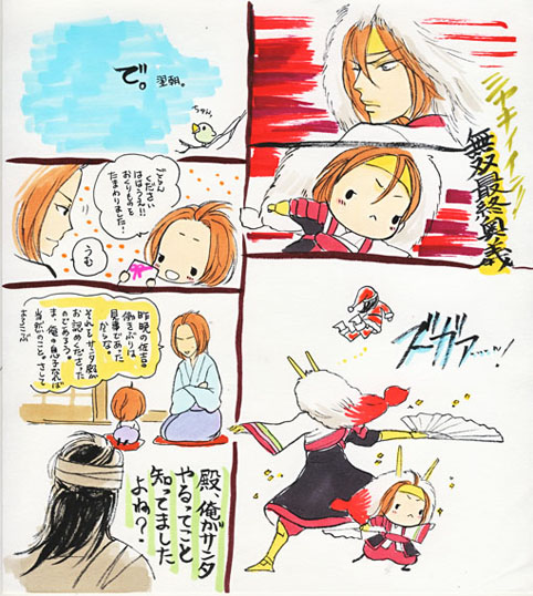 携帯からの方はみにくいですね、 明日当たりコマごとに画像を分けて、携帯用の記事を作りますので 少々お待ちください(^^) …はい、親子最終奥義が描きたかったのです(爆) はて、佐吉のもらったプレゼントは何だったんだろう?(苦笑) |